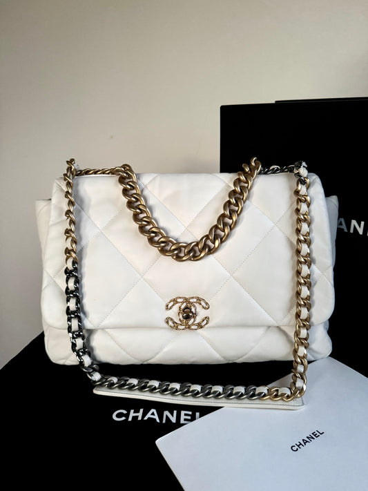Pre-owned Chanel 19 Maxi White Lambskin Flap Bag