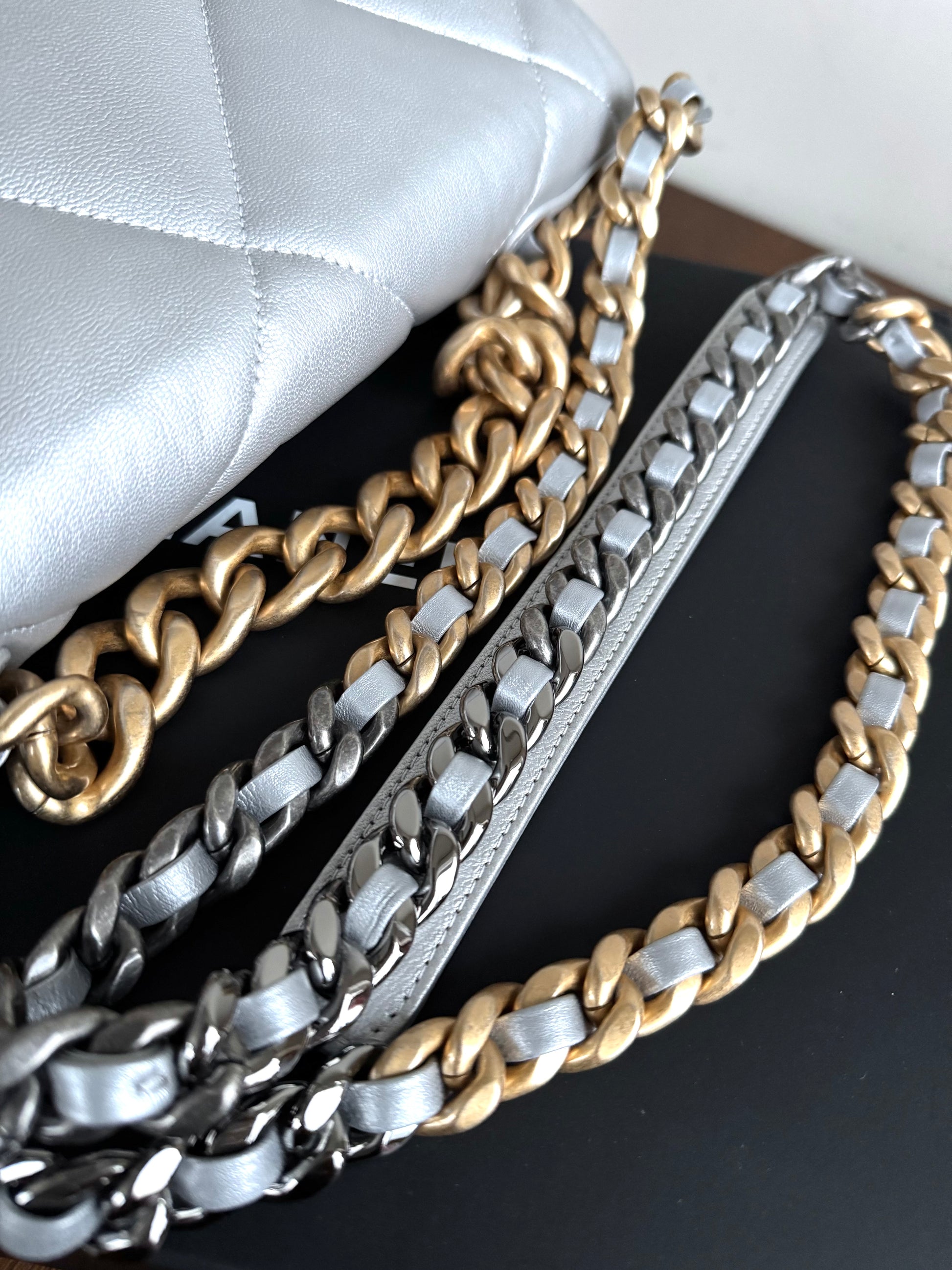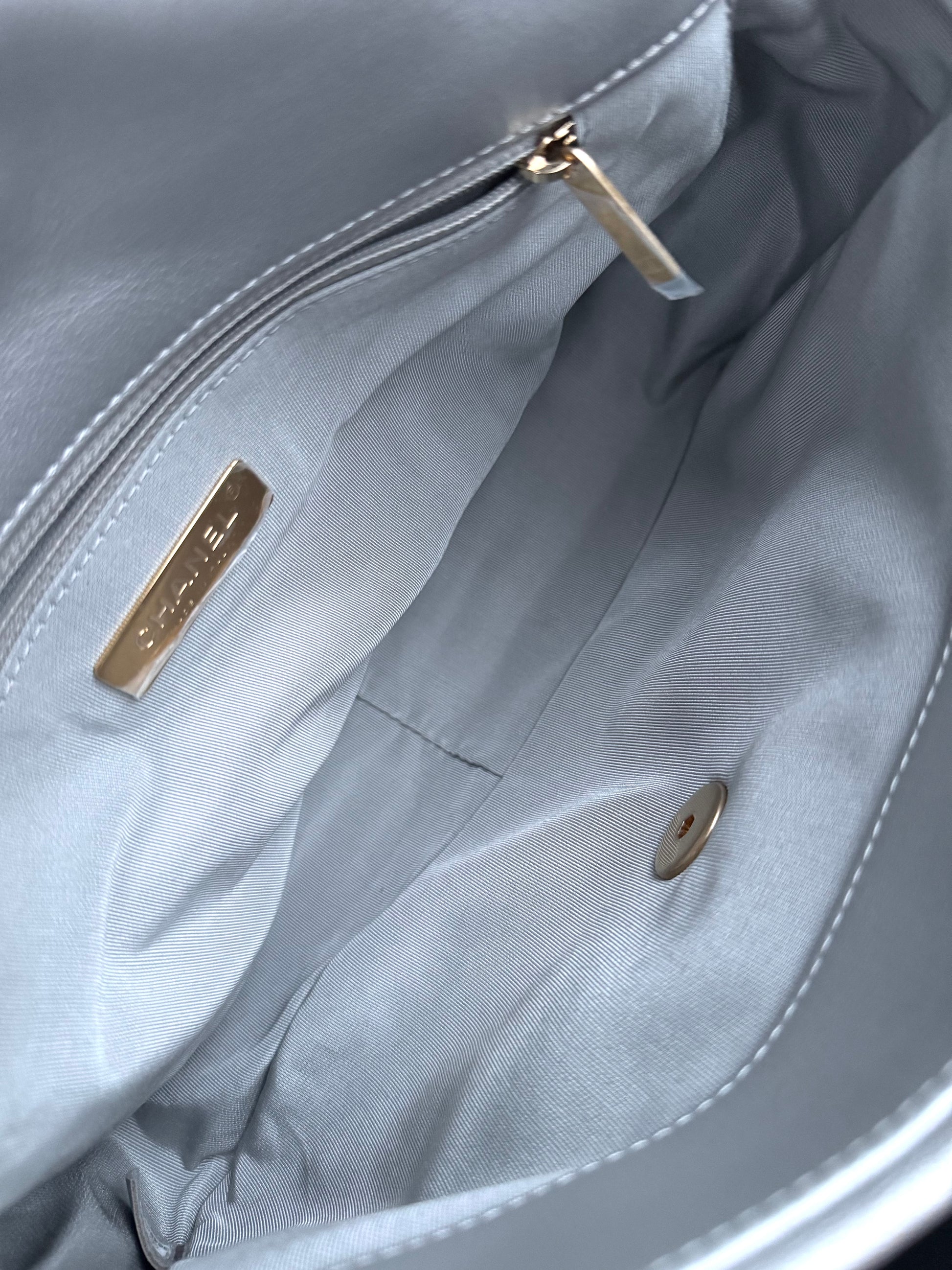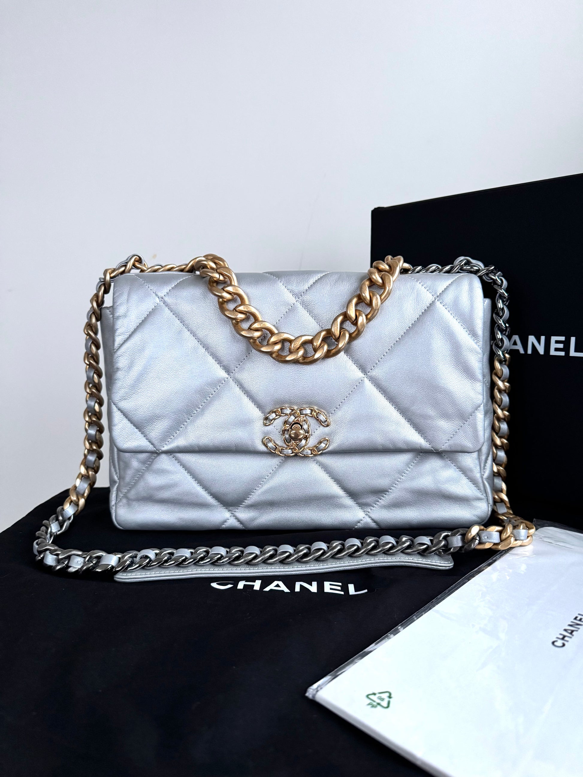 •From the year 2020 (30480707) •Silver lambskin leather •Light grey fabric lining •Gold, silver and ruthenium hardware •The chain is nether removable nor adjustable •Can be worn crossbody •In excellent condition •No visible defects •Sold with the dust bag, box and care booklet •Width:30cm Height:20cm Depth:10cm