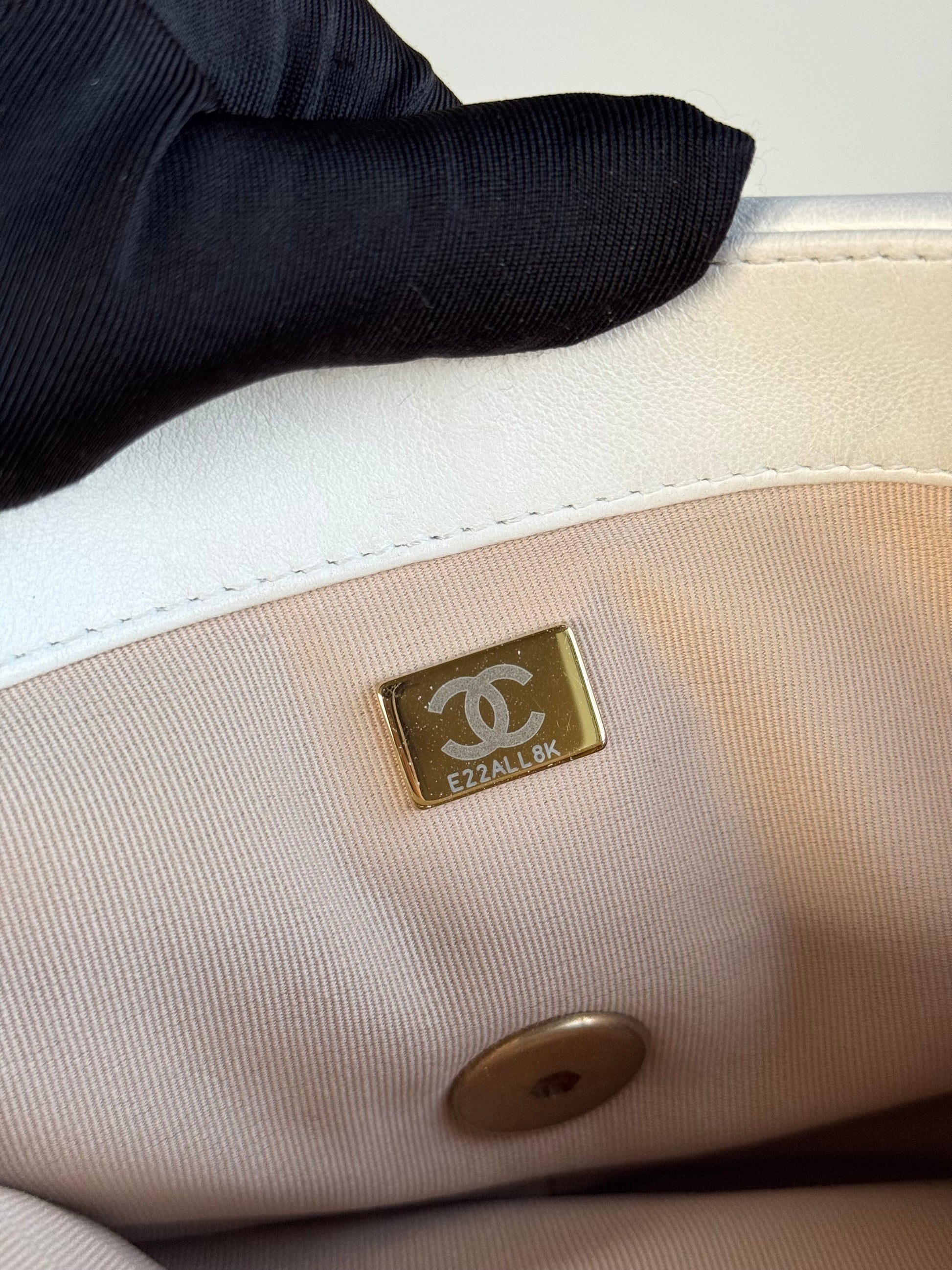 •From the year after 2021, with microchip(E22ALL8K) •White lambskin leather •Beige fabric lining •Gold, sliver and ruthenium hardware •The chain is not removable or adjustable •Can be worn crossbody •In excellent condition •No visible defects •Sold with full accessories: the dust bag, box, care booklet •Width:26cm Height:16cm Depth:9cm