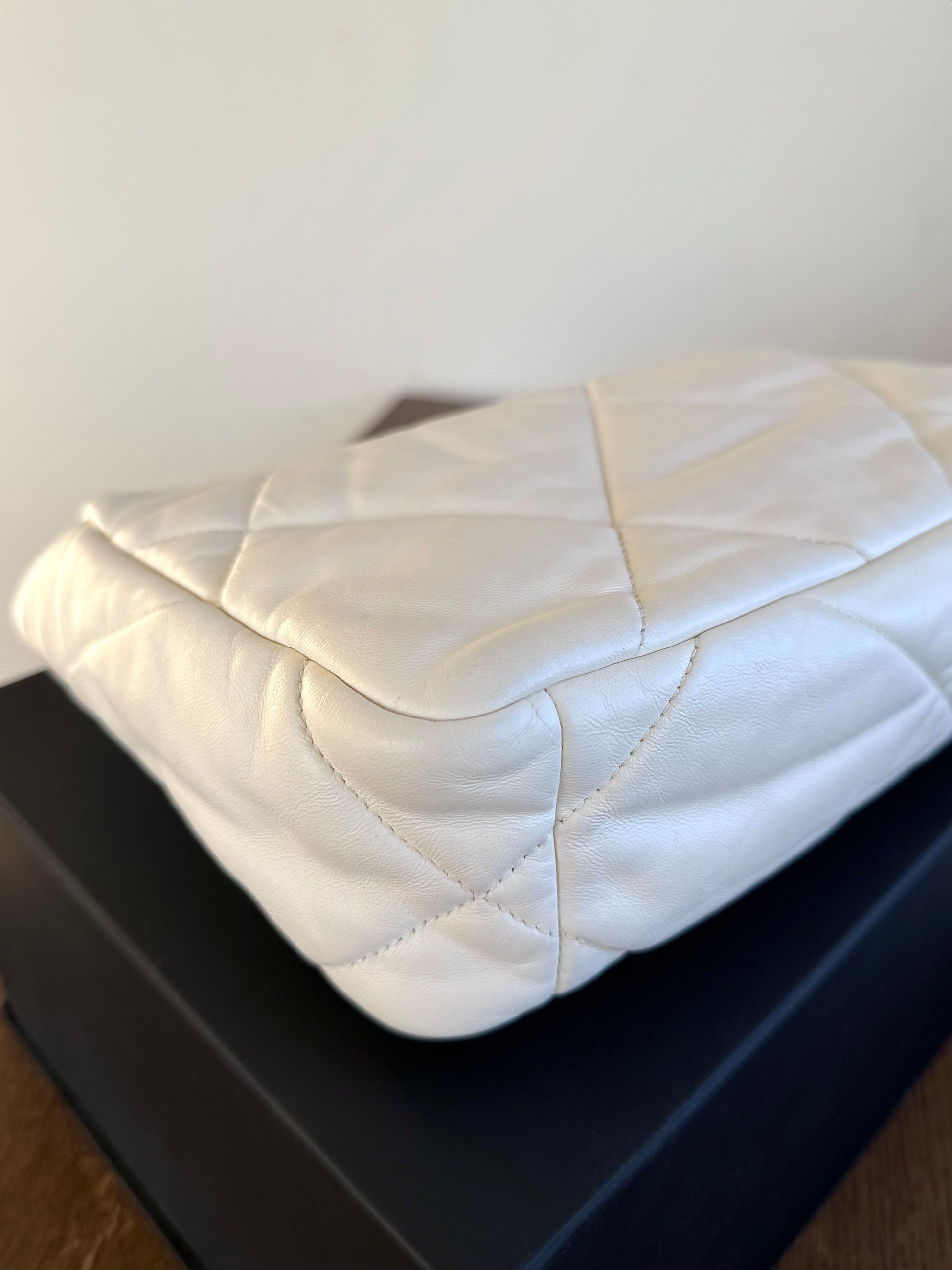 •From the year after 2021, with microchip(E22ALL8K) •White lambskin leather •Beige fabric lining •Gold, sliver and ruthenium hardware •The chain is not removable or adjustable •Can be worn crossbody •In excellent condition •No visible defects •Sold with full accessories: the dust bag, box, care booklet •Width:26cm Height:16cm Depth:9cm
