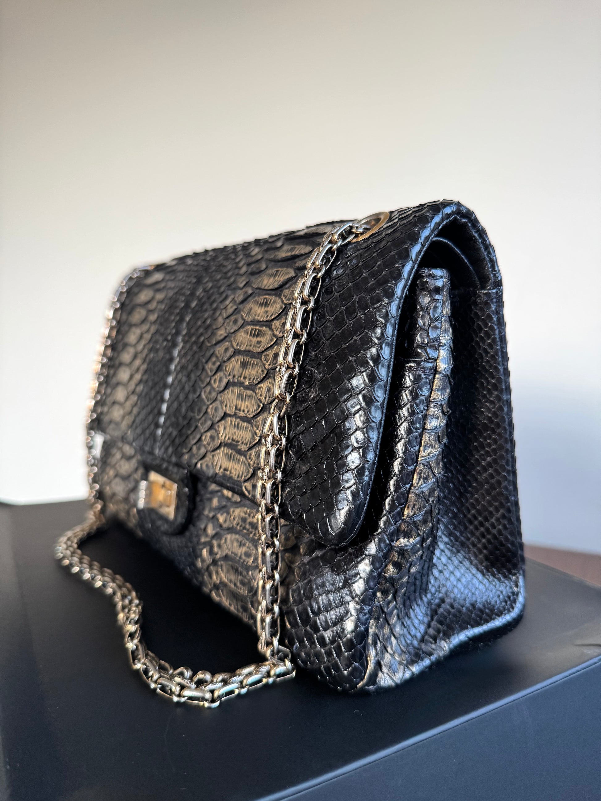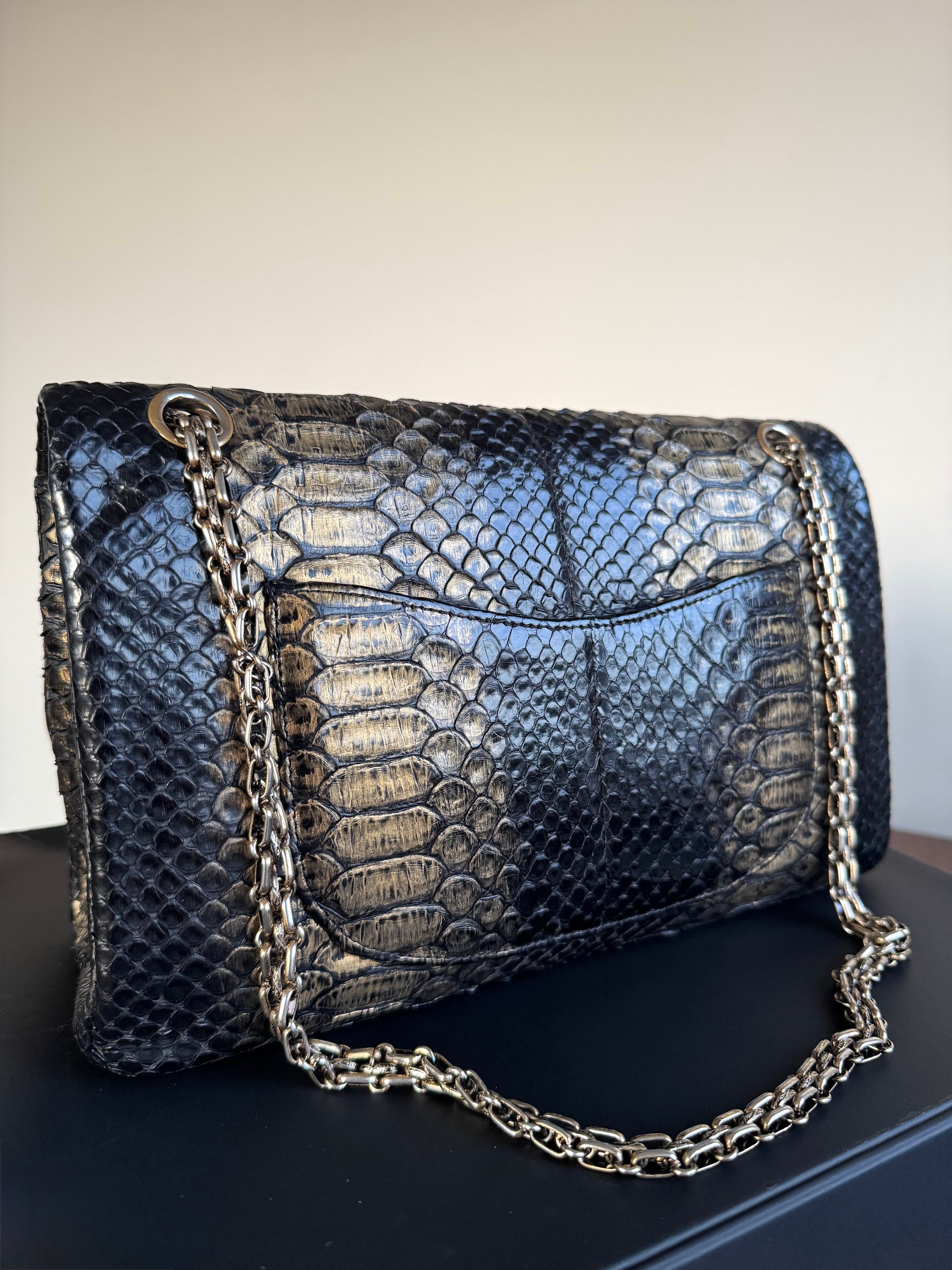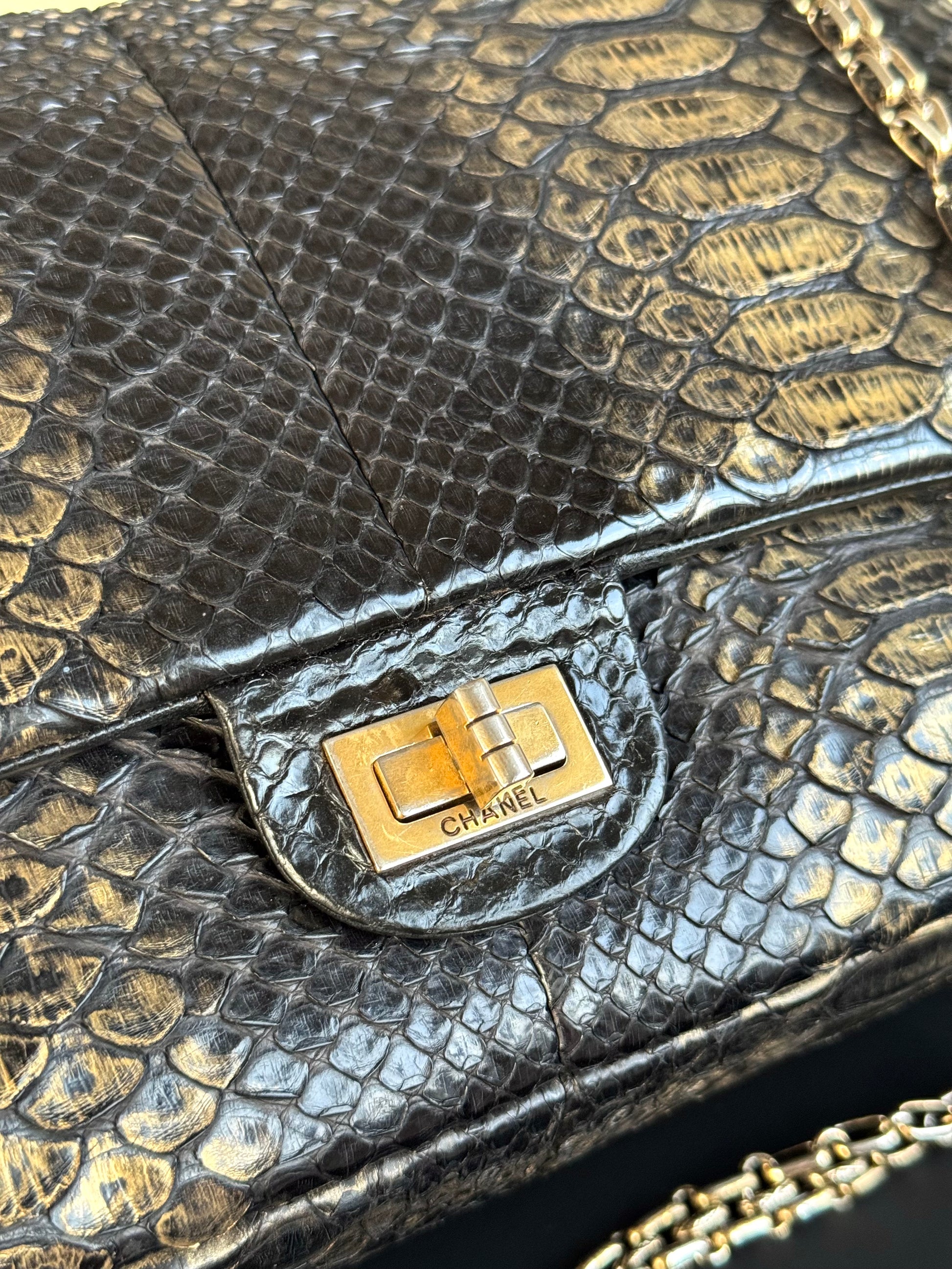 •From the year 2010-2011 (14982609) •Black gold python •Black lambskin lining •Gold hardware •The chain is not removable but adjustable •Can be worn crossbody •In excellent condition •There’s slight signs of wear on the metal buckle •Sold with the dust bag, box and care booklet •Width:28cm Height:20cm Depth:7cm