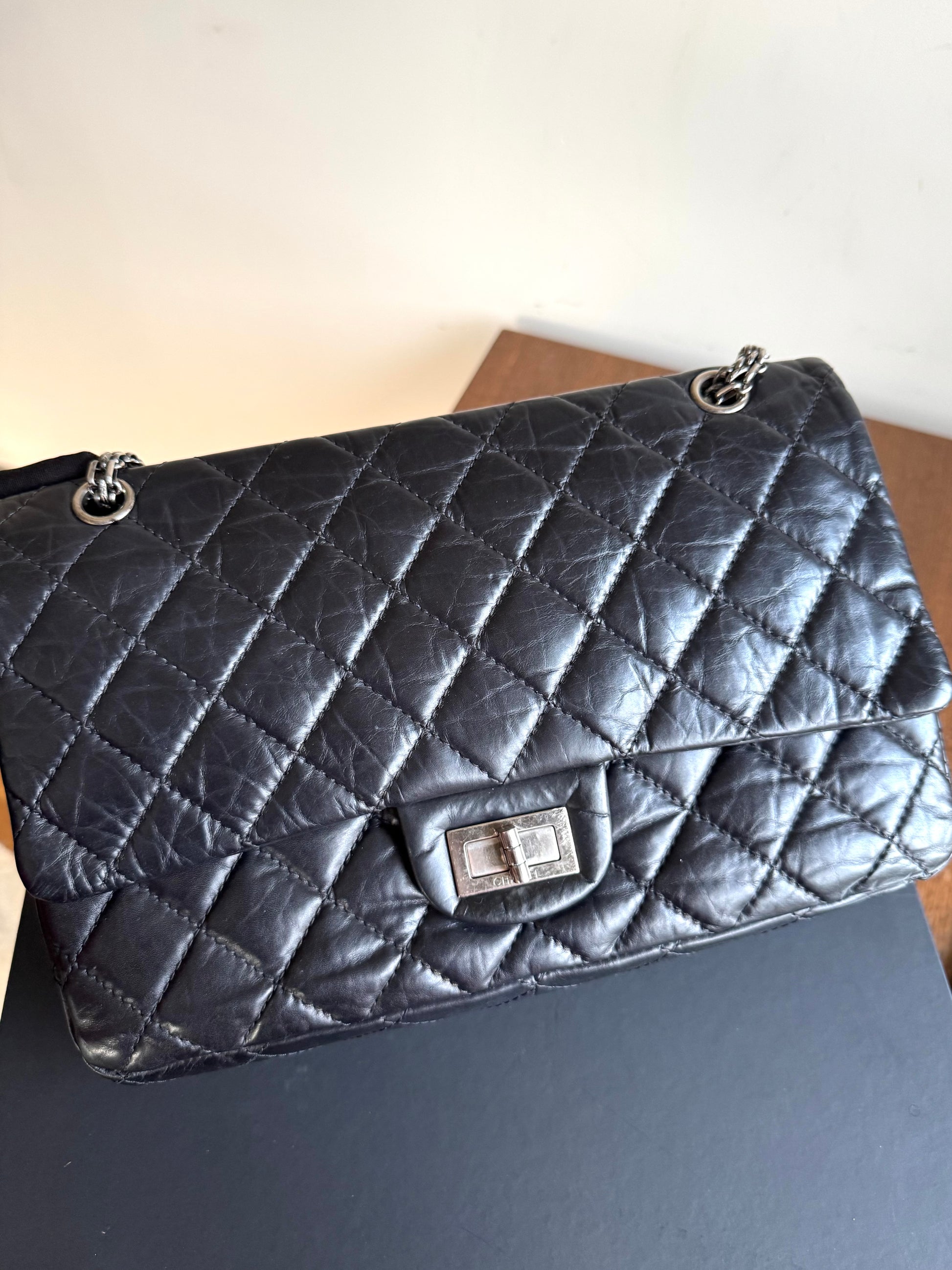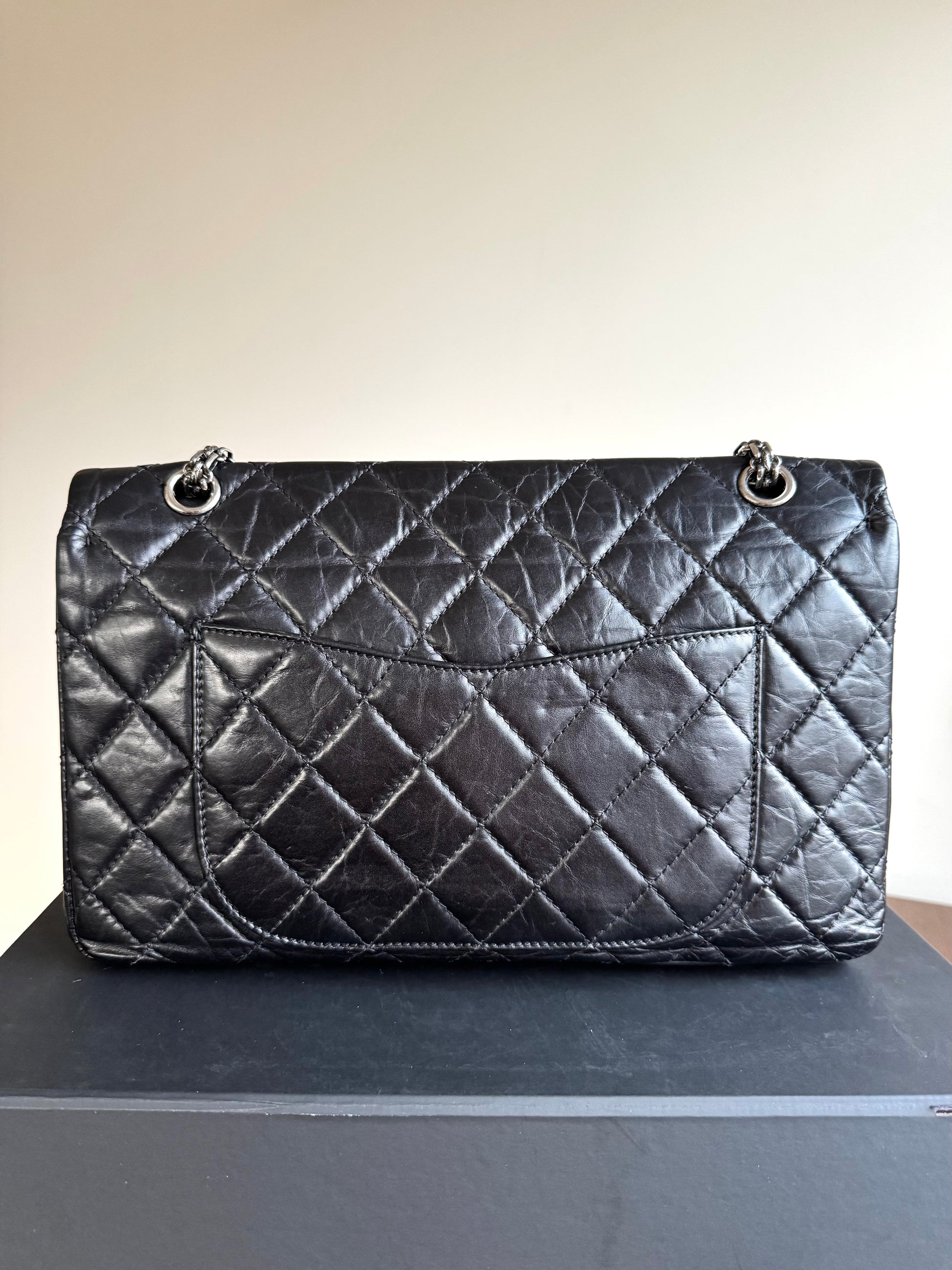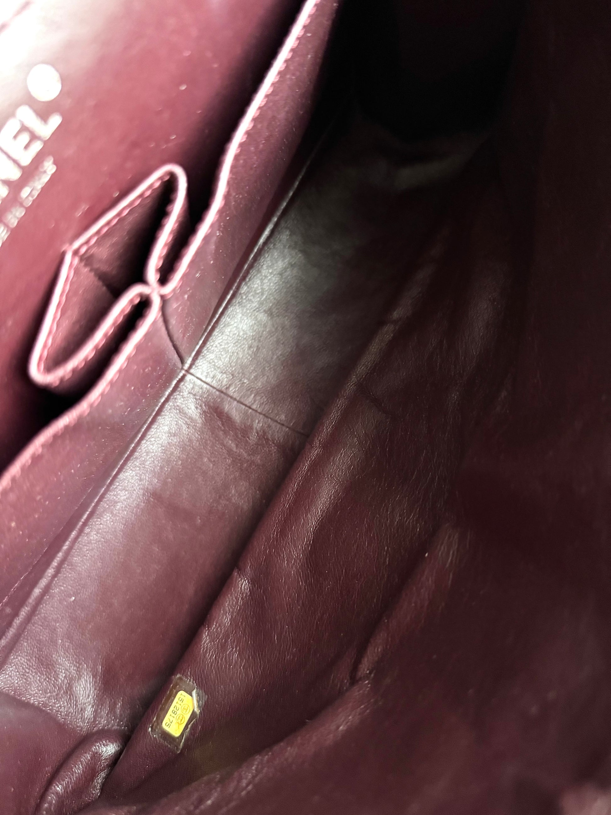 •From the year 2011-2012 (15128175) •Black calfskin leather •Burgundy leather lining •Ruthenium hardware •The chain is not removable but adjustable •Can be worn crossbody •In very good condition •There is a dot-shaped indentation on the flap, and some pressure marks on the back caused by the chain •Sold with the tag, dust bag, box and care booklet •Width:32cm Height:20cm Depth:10cm