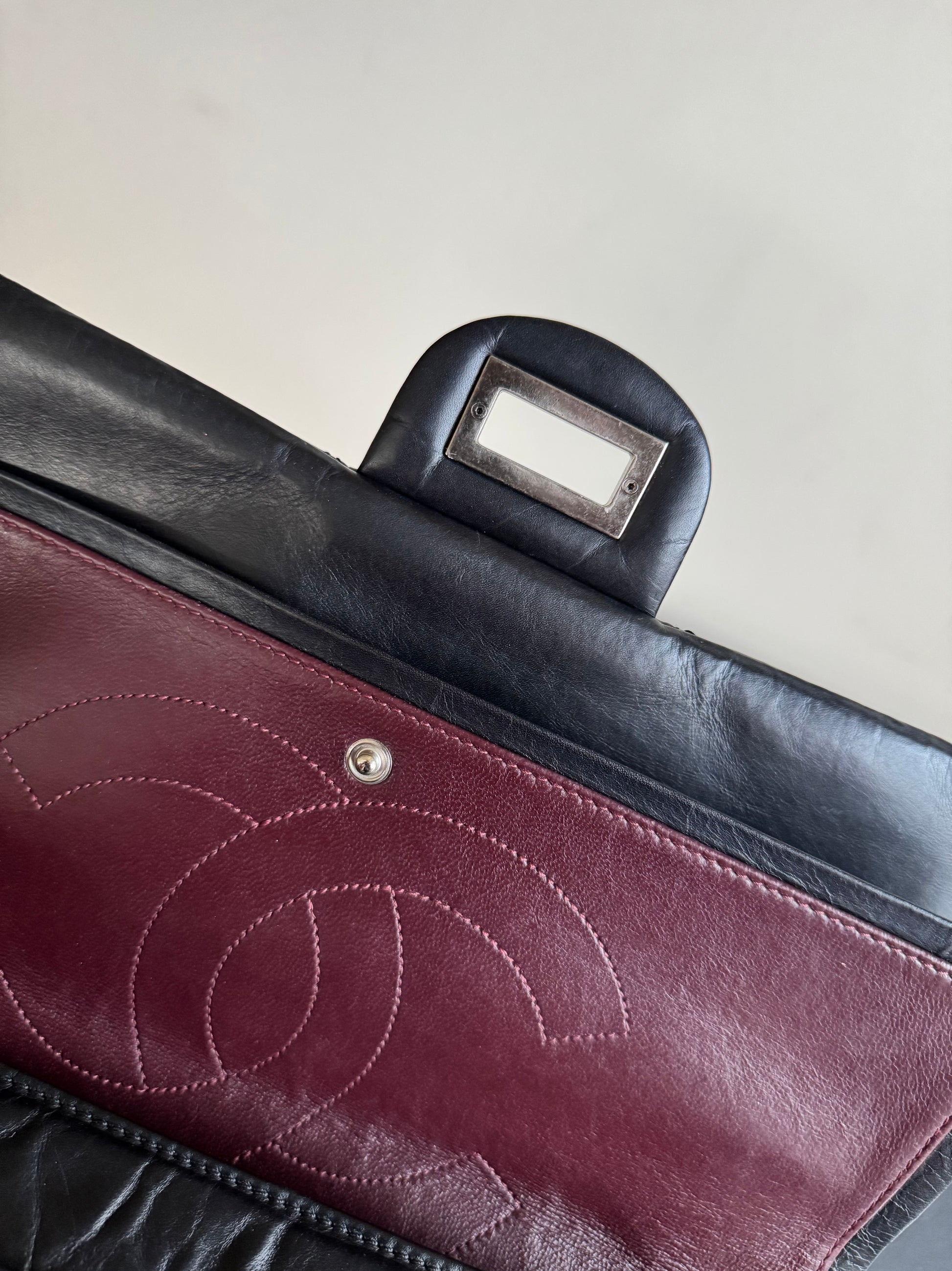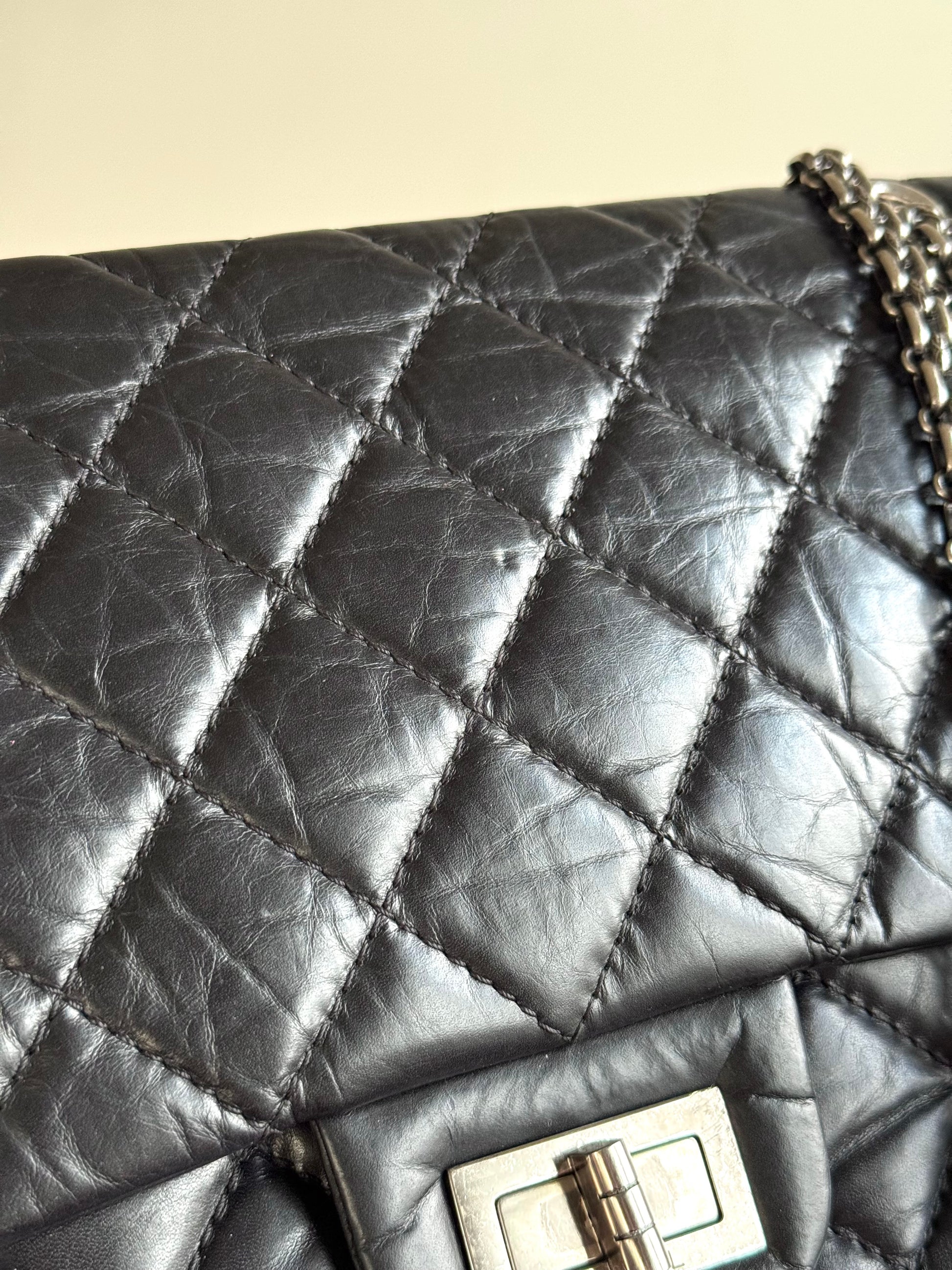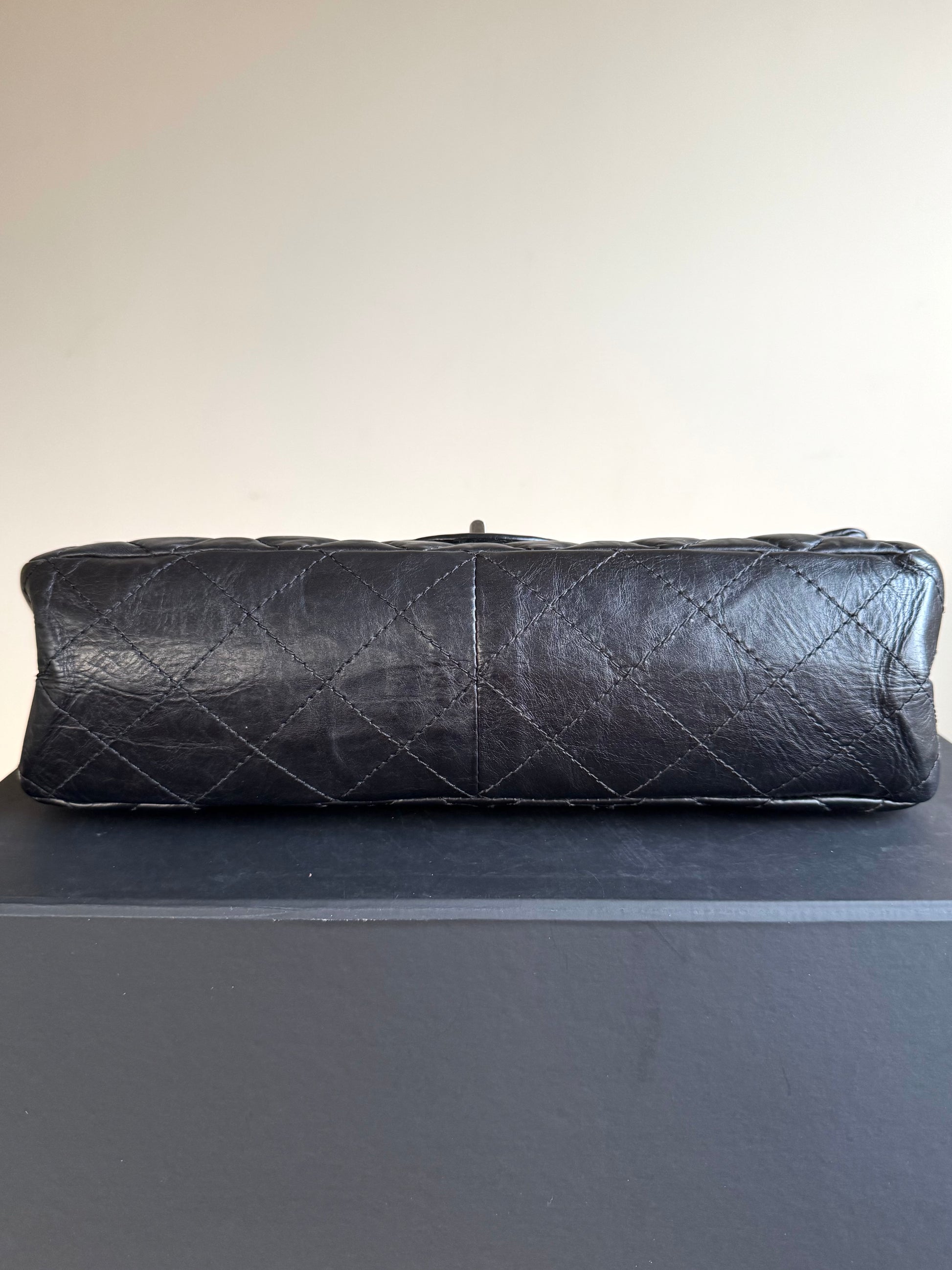 •From the year 2011-2012 (15128175) •Black calfskin leather •Burgundy leather lining •Ruthenium hardware •The chain is not removable but adjustable •Can be worn crossbody •In very good condition •There is a dot-shaped indentation on the flap, and some pressure marks on the back caused by the chain •Sold with the tag, dust bag, box and care booklet •Width:32cm Height:20cm Depth:10cm