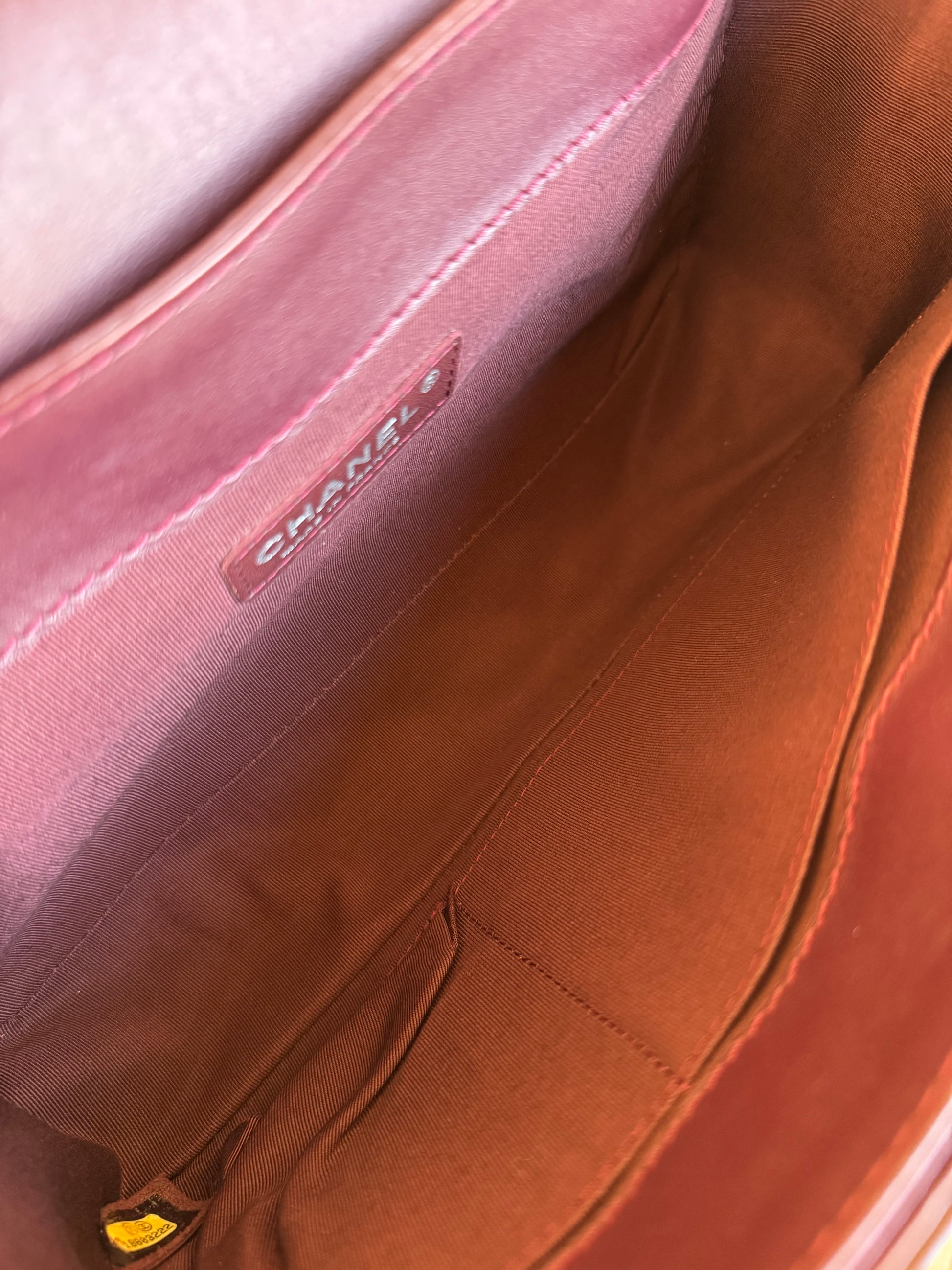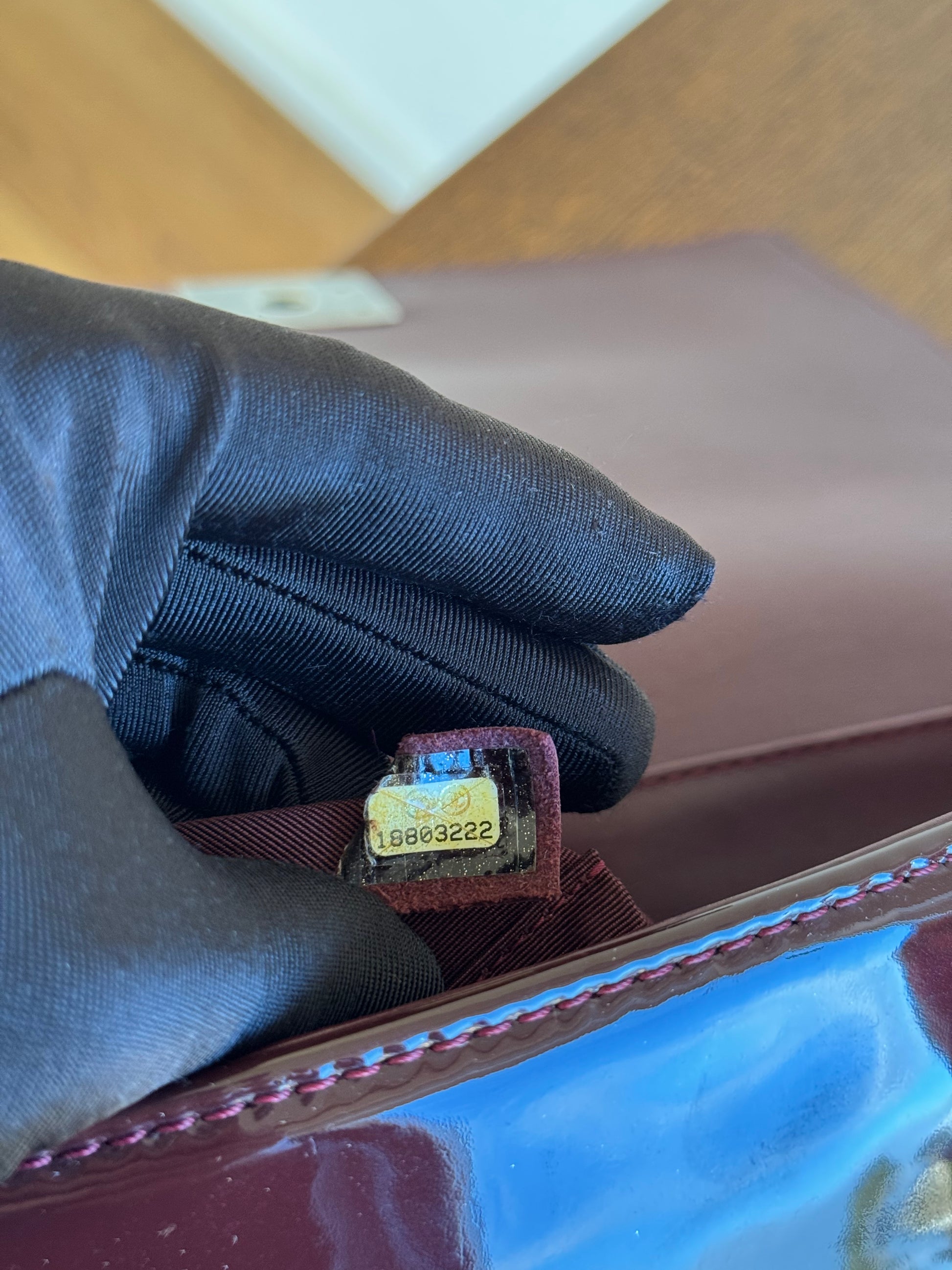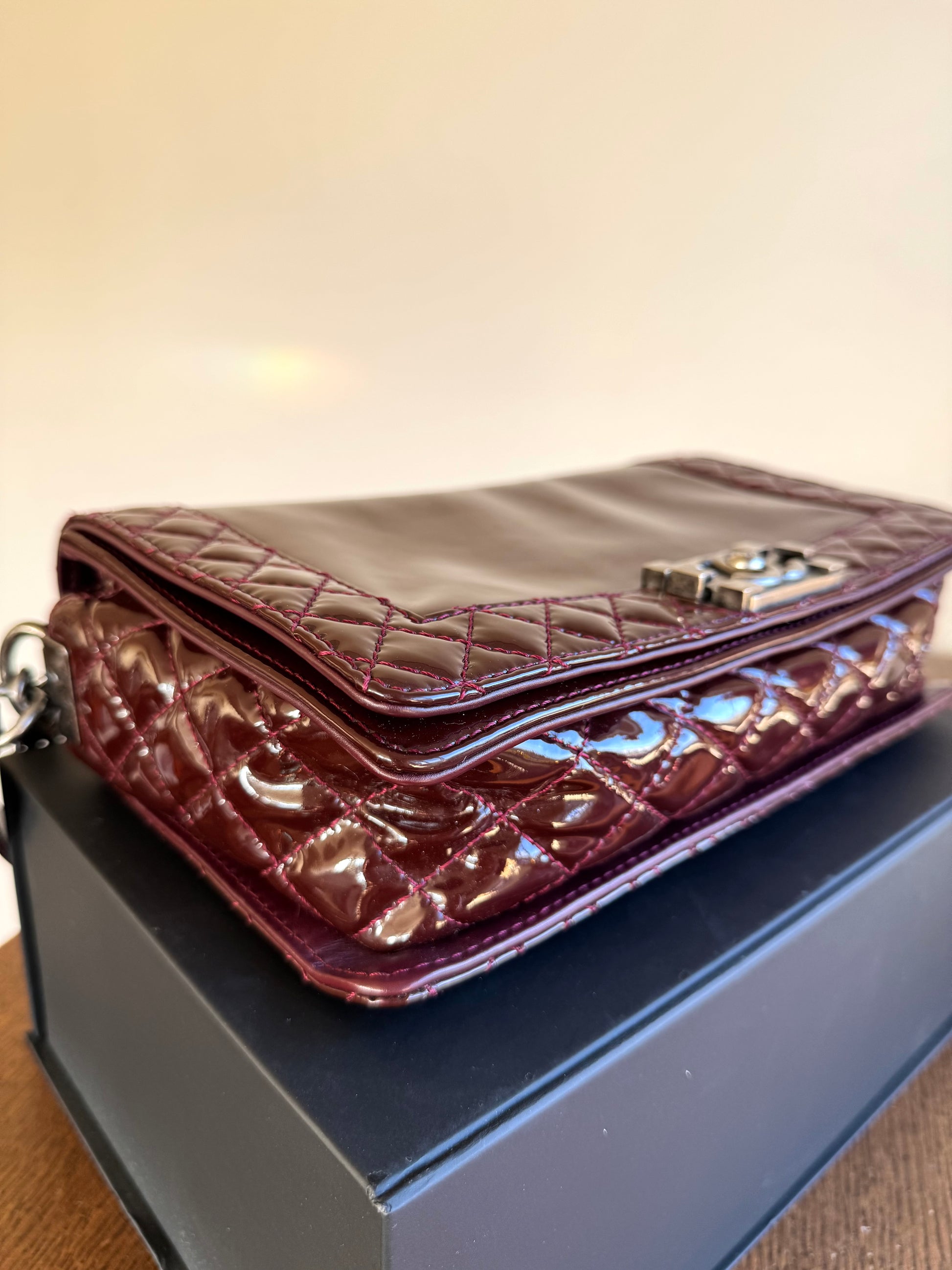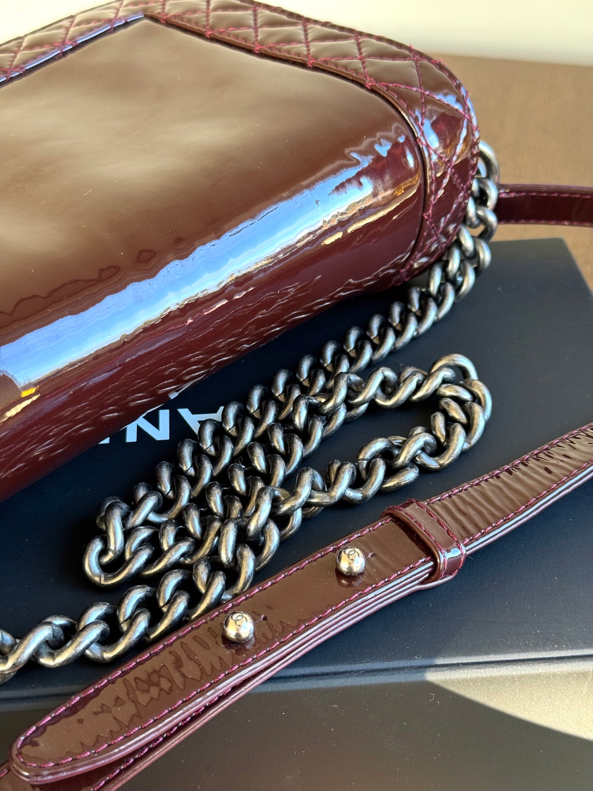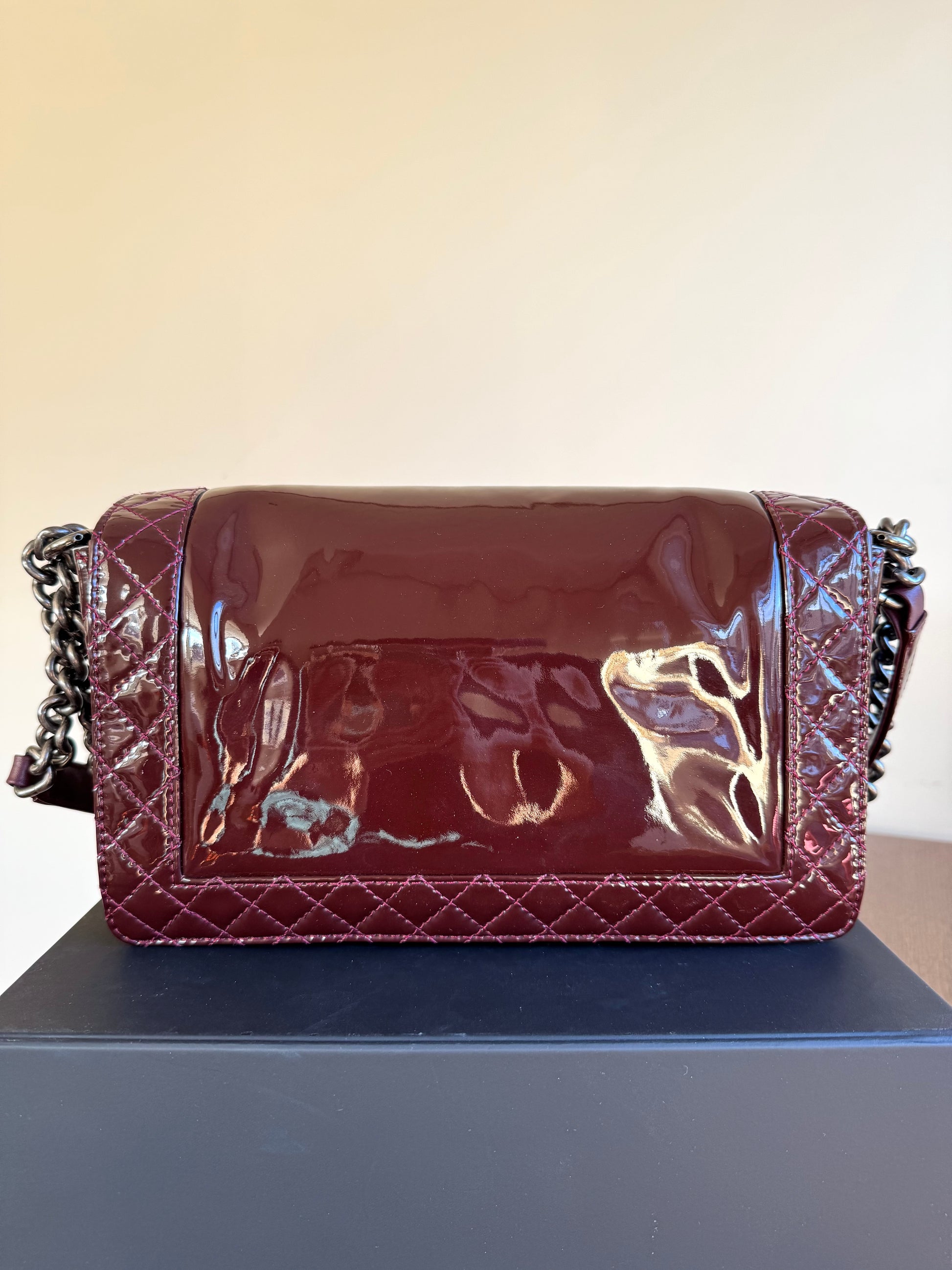 •From the year 2013-2014 (18803222) •Burgundy patent leather •Burgundy leather and fabric lining •Ruthenium hardware •The chain is removable and adjustable •Can be worn crossbody •In very good condition •Sold with the dust bag, box, care booklet and cleaning glove •Width:28cm Height:18cm Depth:9cm