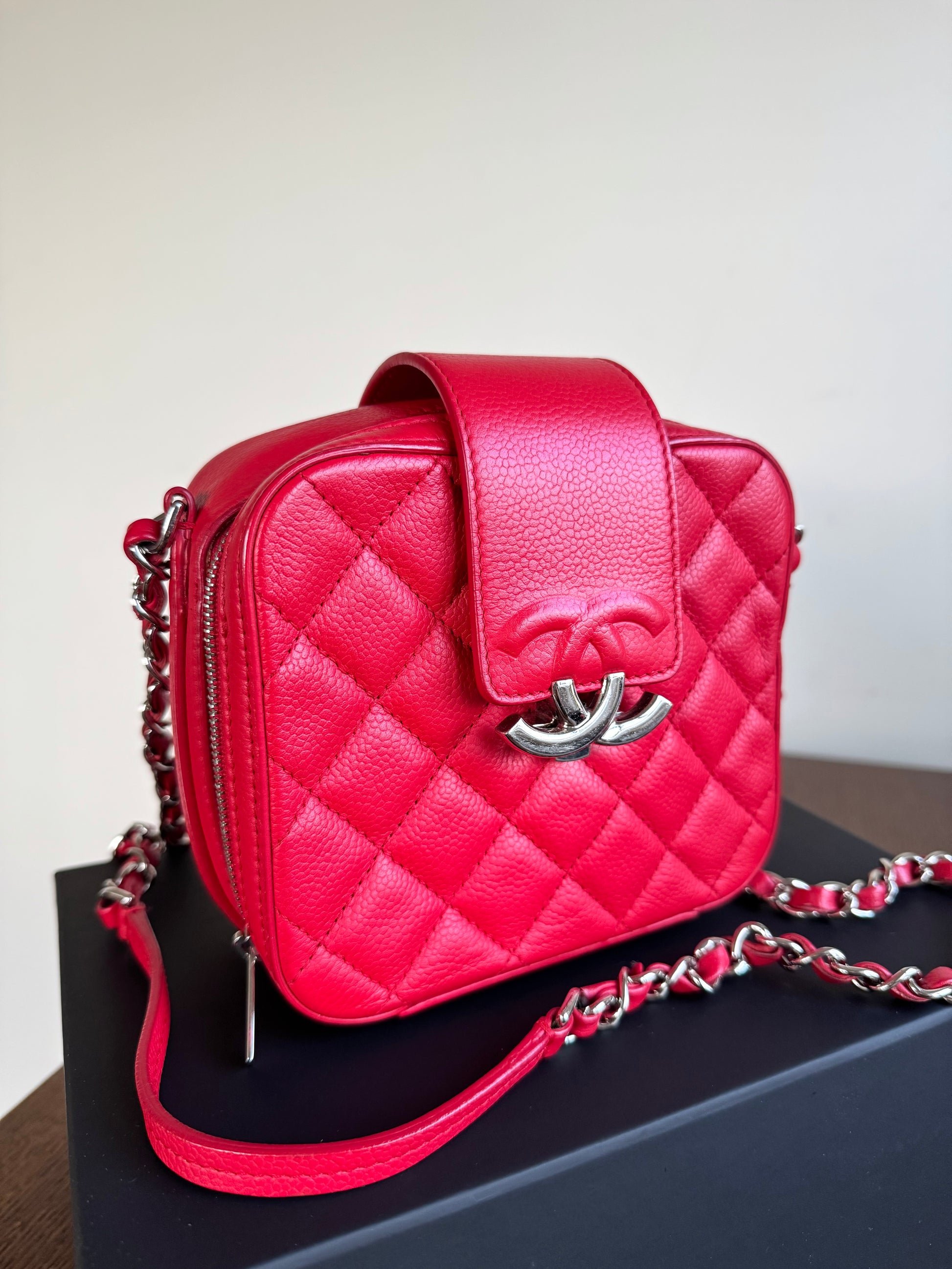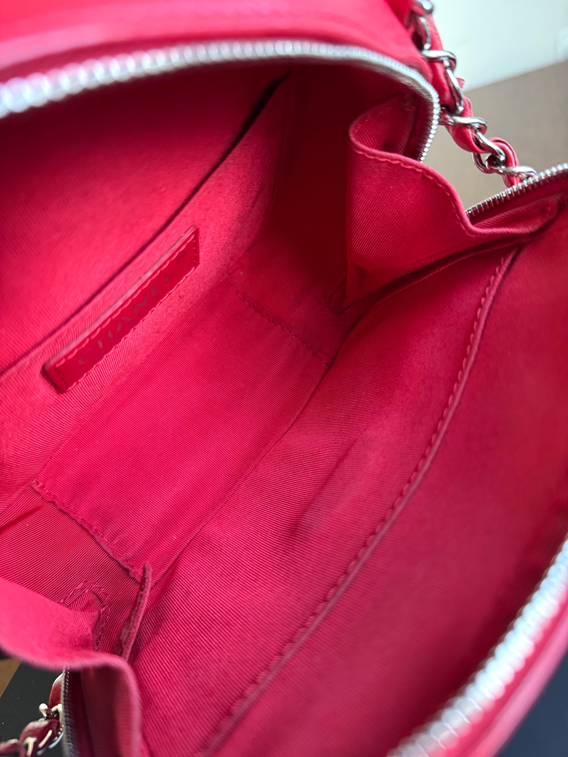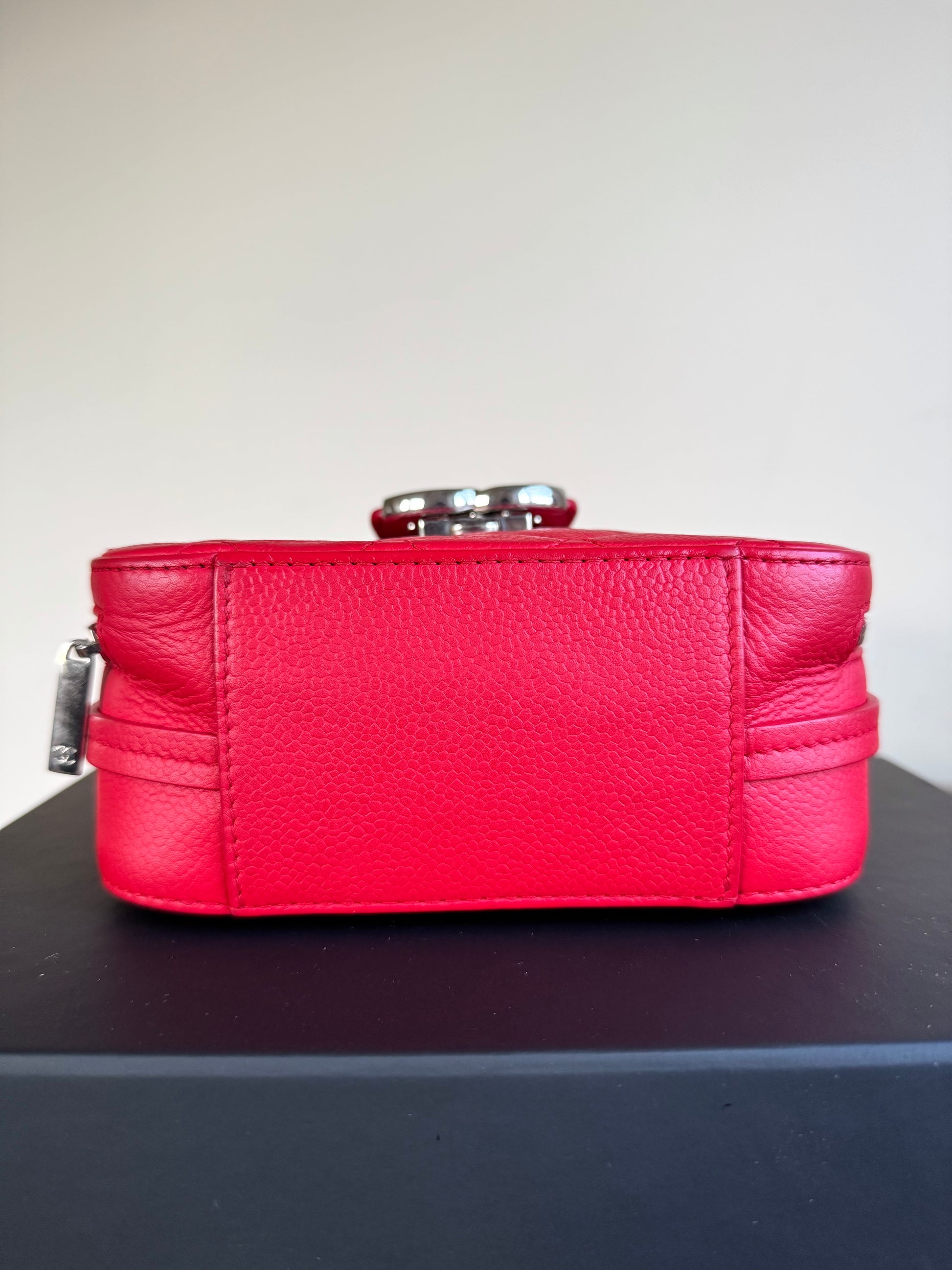 •From the year 2017-2018(24176463) •Red calfskin leather •Red fabric lining •Silver hardware •The chain is not removable or adjustable •Can be worn crossbody •In very good condition •There are only a few minor scratches on the hardware •Sold with the dust bag, box, care booklet •Width:16cm Height:14cm Depth:8cm