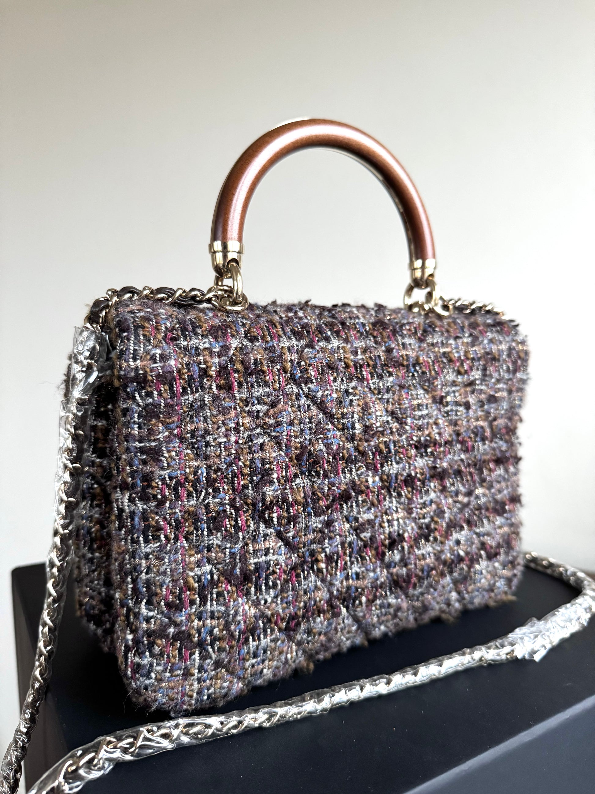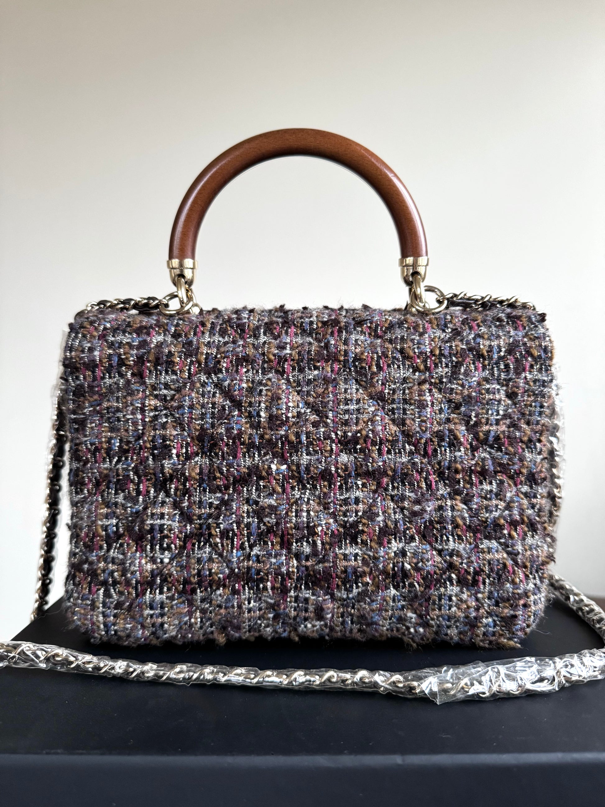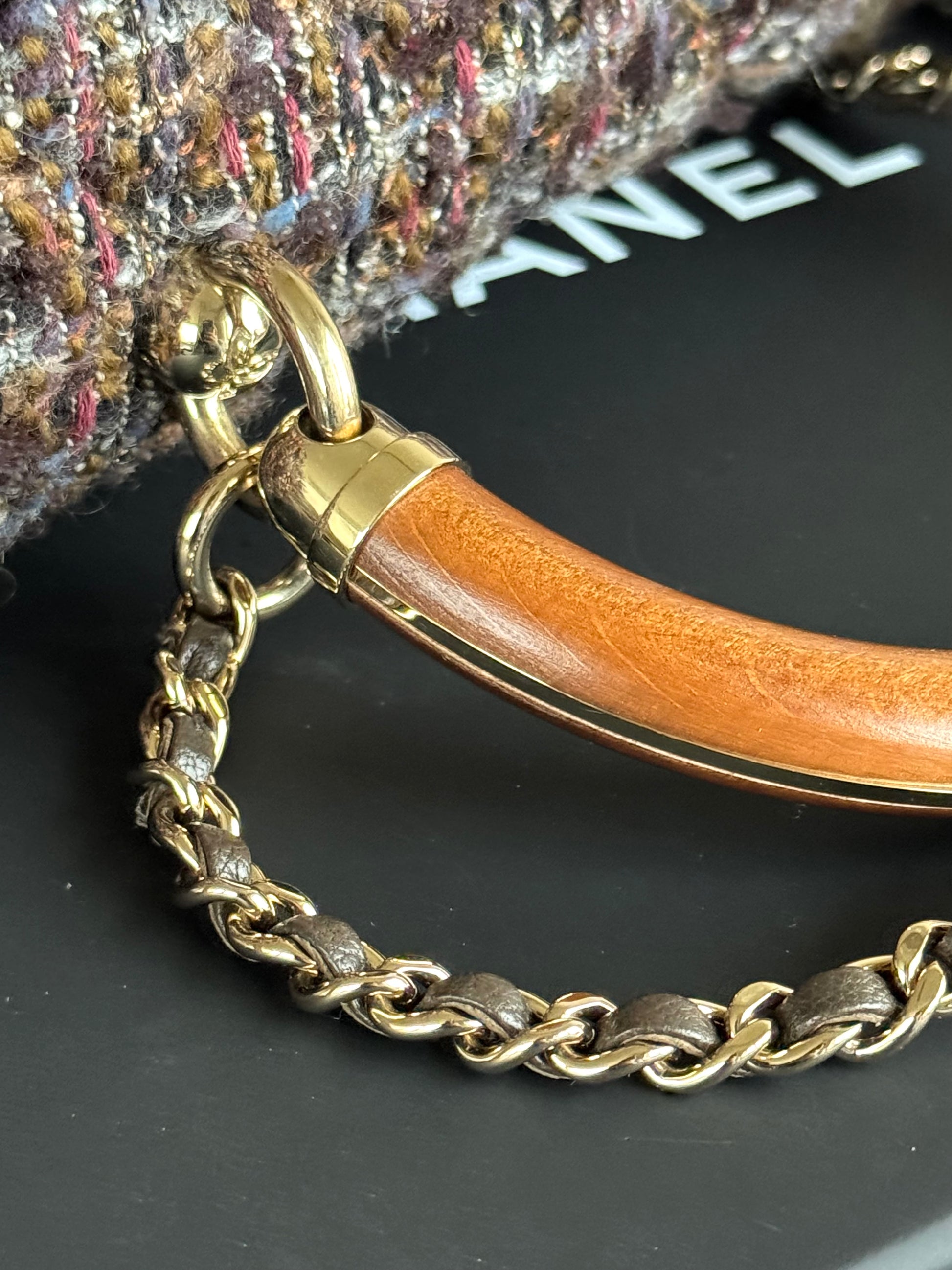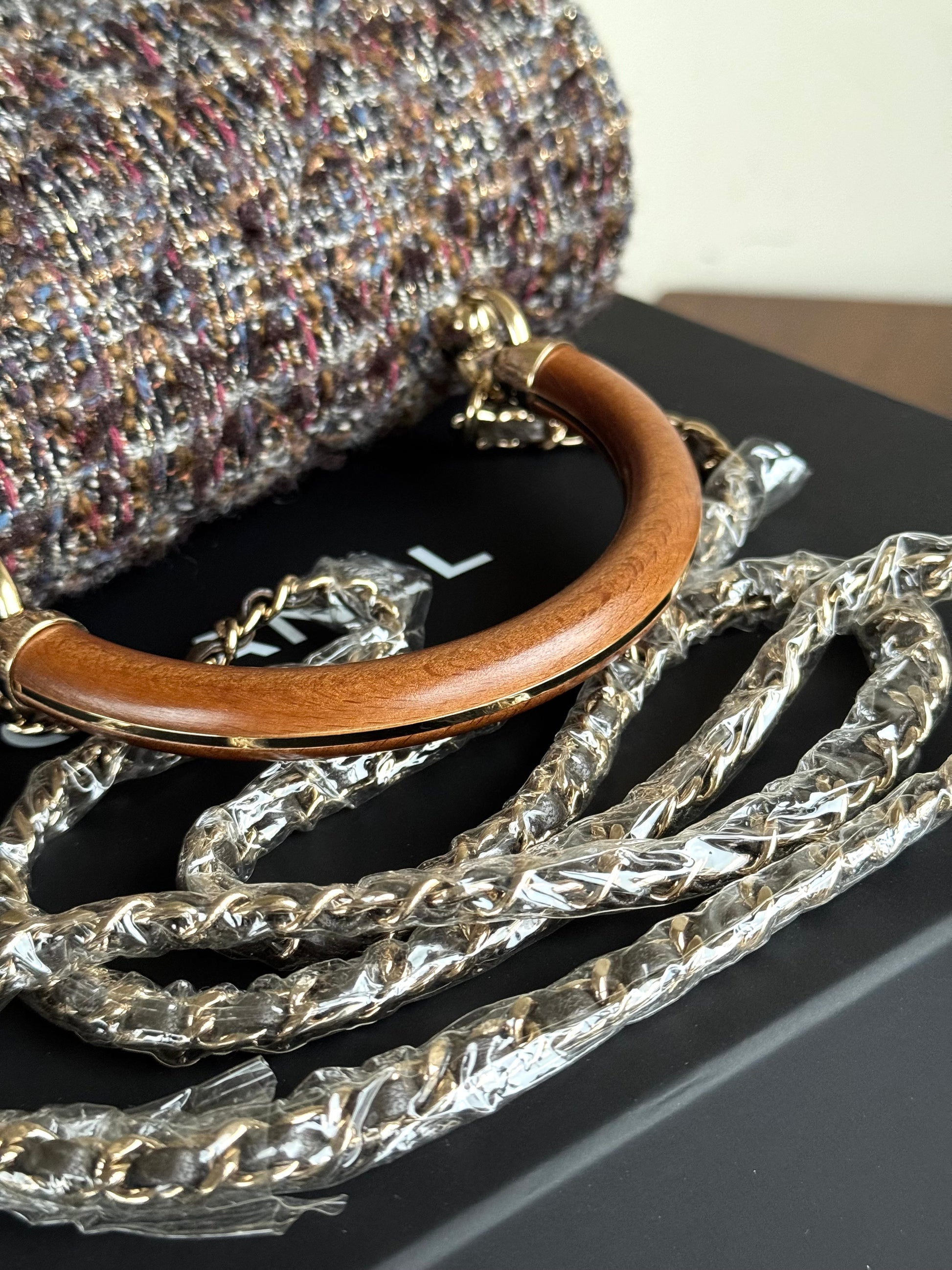 •From the year 2018 (26497925) •Brown tweed with wood handle •Brown fabric lining •Gold hardware •The chain is neither removable nor adjustable •Can be worn crossbody •In excellent condition •No visible defects •Sold with the dust bag, box, care booklet and cleaning glove •Width:22cm Height:16cm Depth:10cm