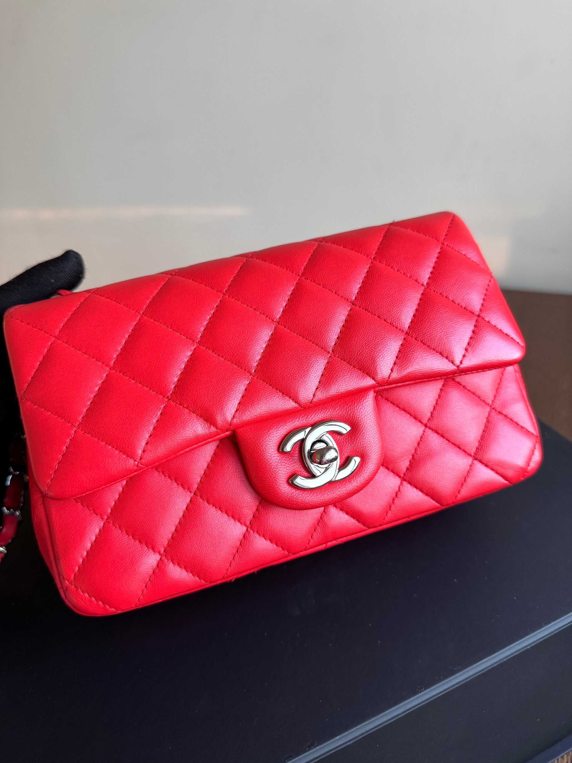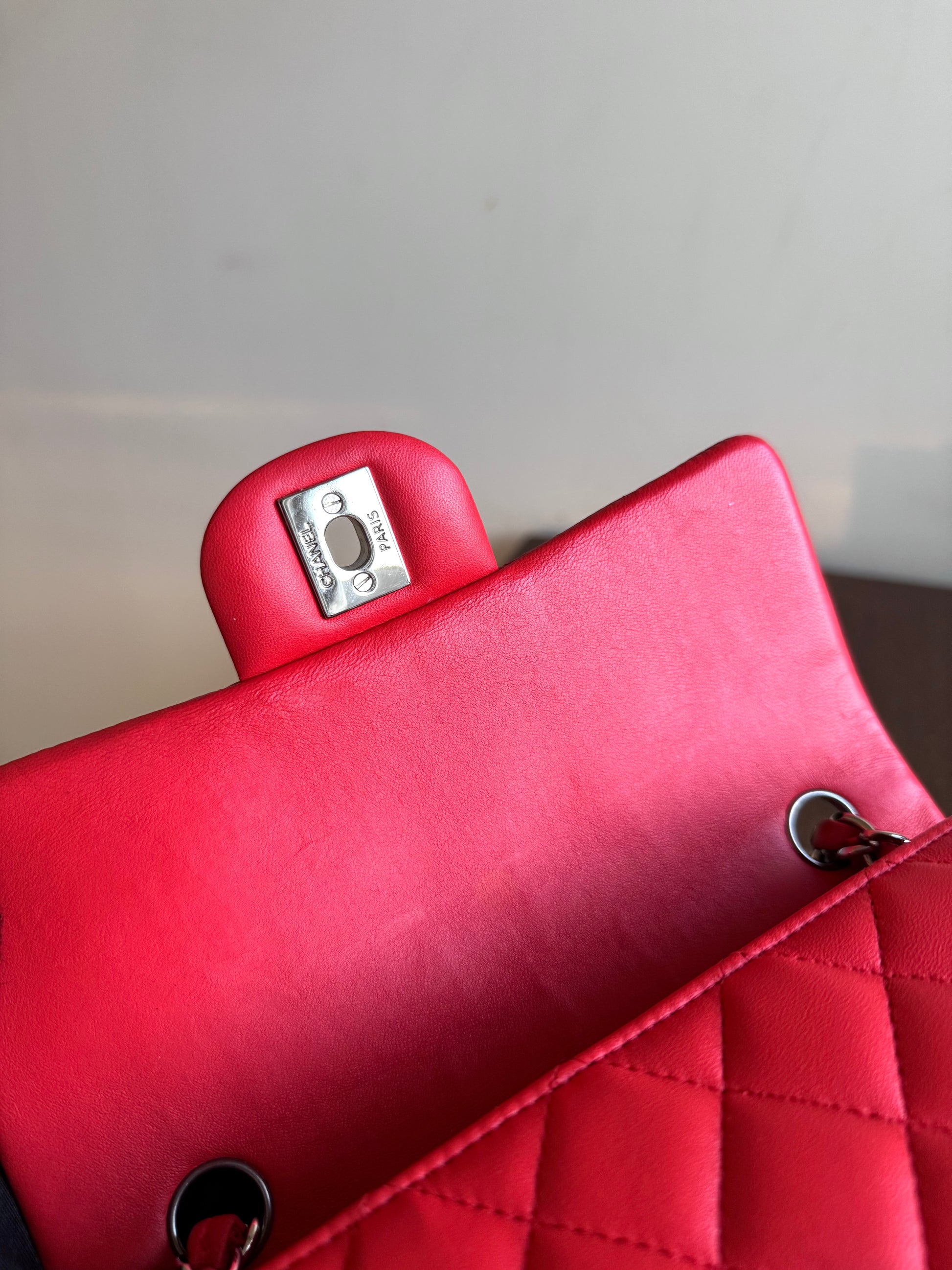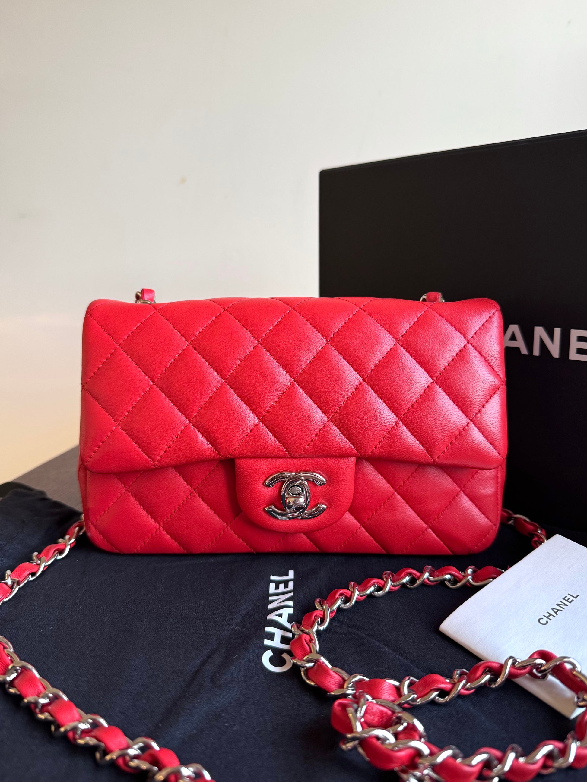 •From the year 2018-2019 (26971134) •Coral red lambskin leather •Coral red leather lining •Silver hardware •The chain is nether removable nor adjustable •Can be worn crossbody •In very good condition •There are slight indentations on the bottom of the bag •Sold with the dust bag, box and care booklet •Width:20cm Height:12cm Depth:6cm