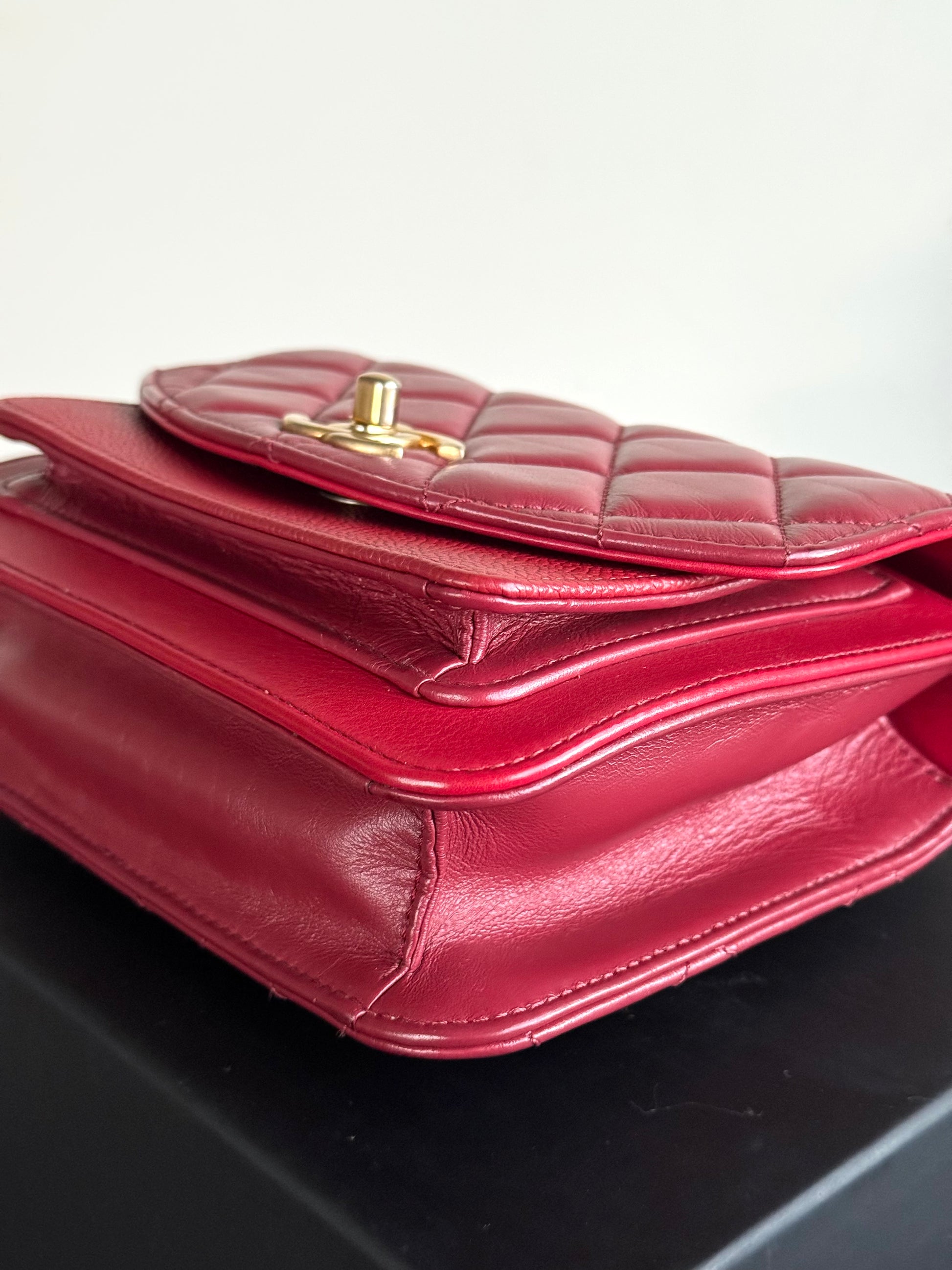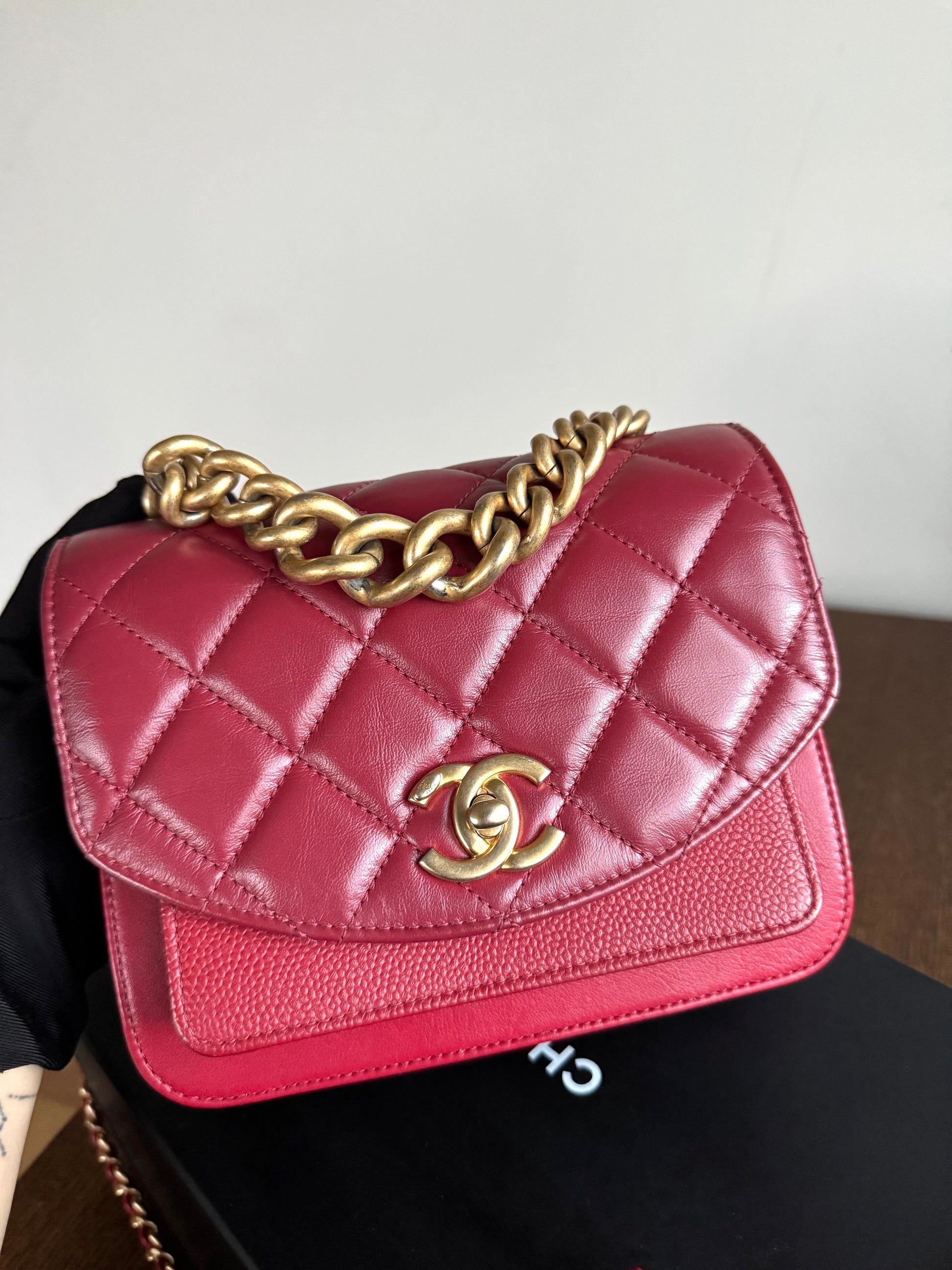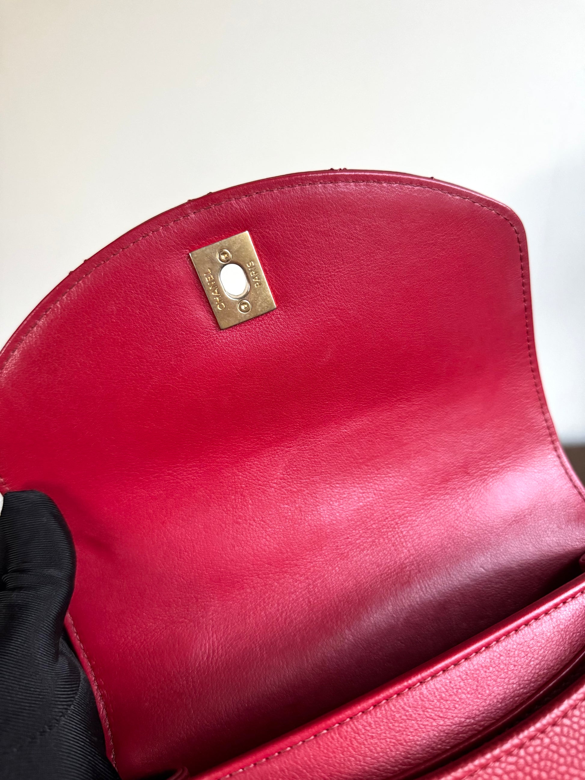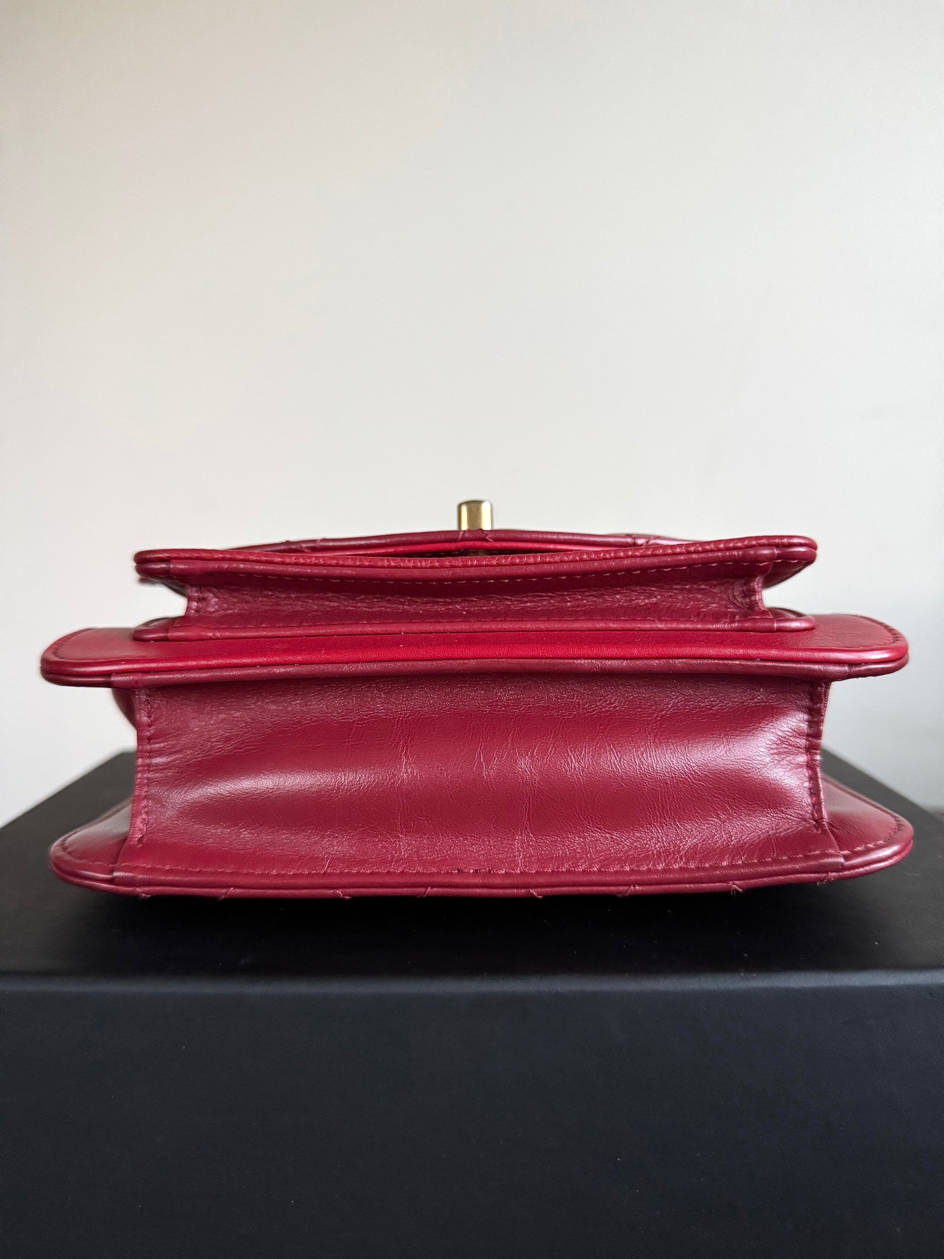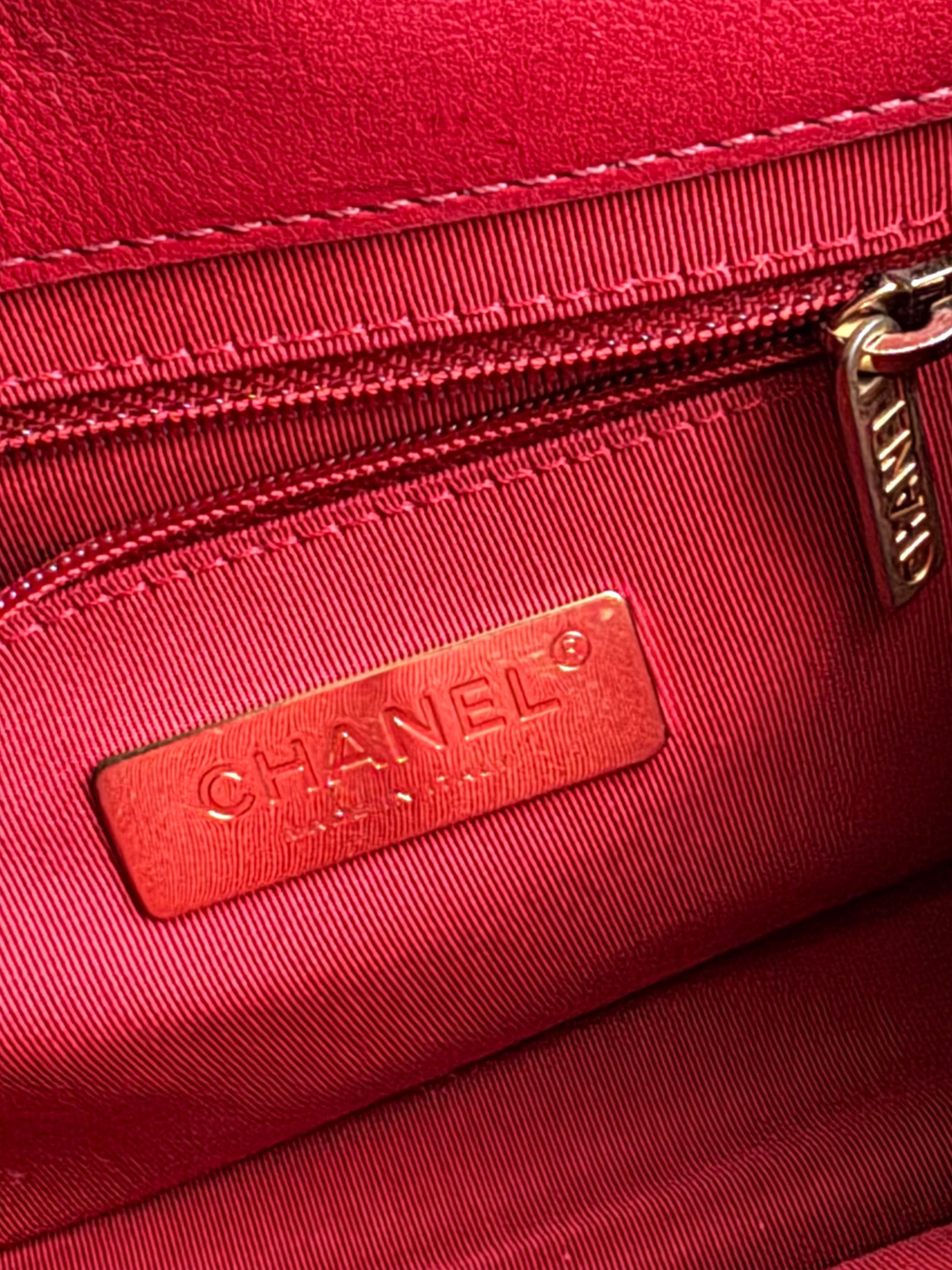 •From the year 2019 (28253185) •Red caviar and burgundy calfskin •Red fabric lining •Gold hardware •The chain is neither removable nor adjustable •Can be worn crossbody •In excellent condition •No visible defects •Sold with full accessories: the authenticity card, dust bag, box, care booklet and cleaning glove •Width:19cm Height:15cm Depth:5cm